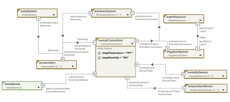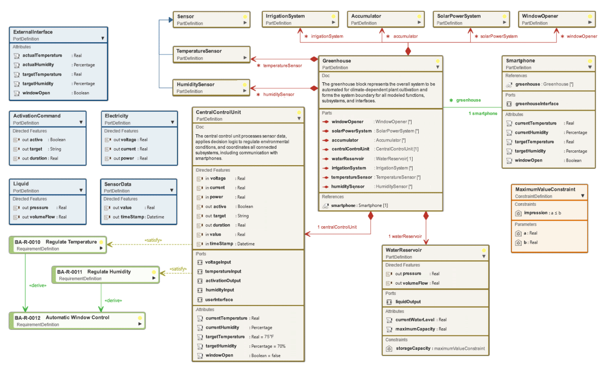 The greenhouse is the model of the entire automated system for cultivating climate-dependent plants. It also forms the boundary of all modeled functions, subsystems, and interfaces.