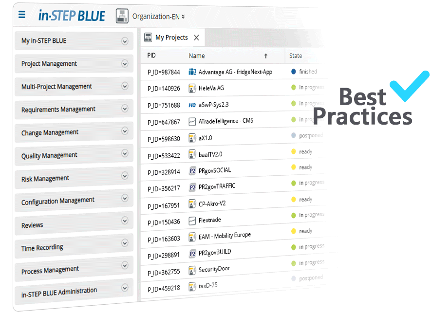 Being able to work with processes is very important for all companies, not just manufacturers. Processes are becoming more important in projects. With processes management you can learn from and repeat positive experiences. in-STEP BLUE can be used for your project plans and processes, for capturing requirements, for administering ideas or initiating projects and much more. All of which can be done in a single environment. And best of all: with in-STEP BLUE you do not only administer project templates, you can manage your projects and programs in real time. With all your staff members.