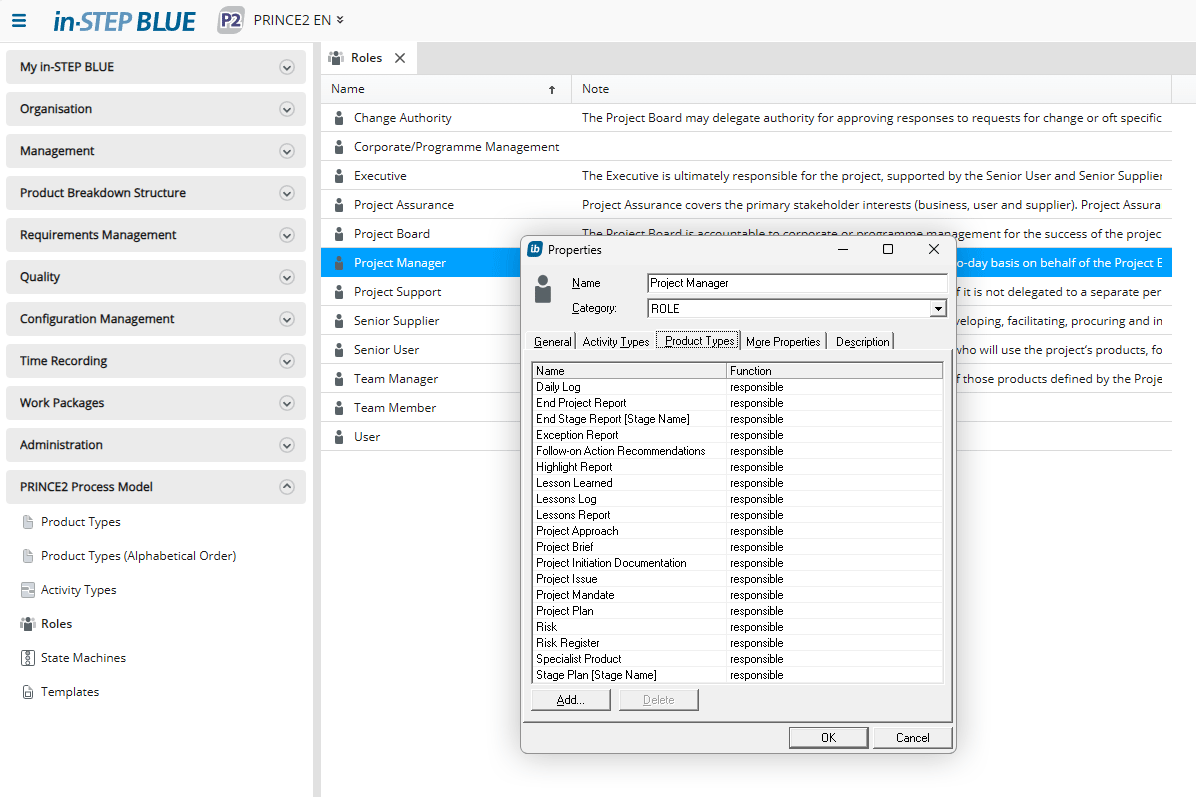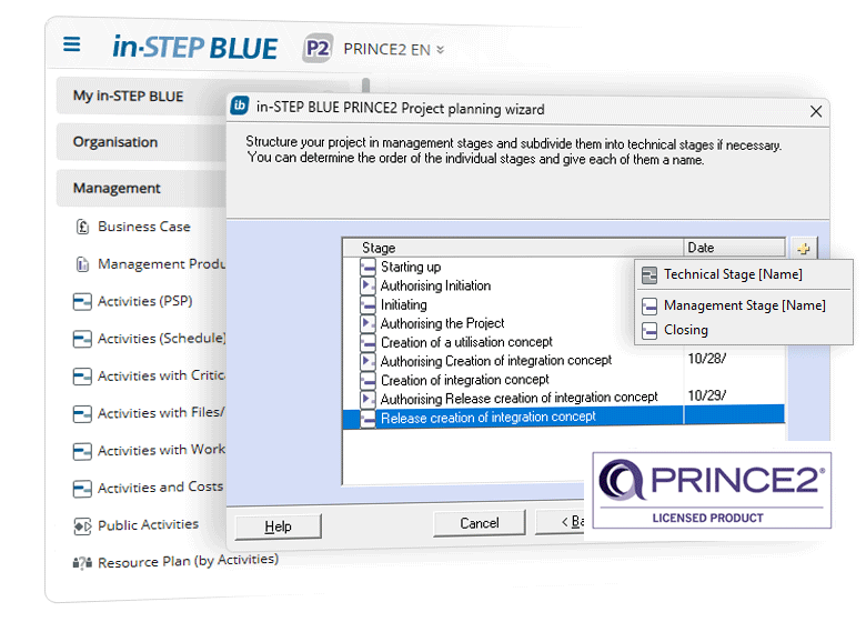 PRINCE2 defines the approach, the project management software in-STEP BLUE makes it visible. An integrated project planning wizard helps you to benefit from PRINCE2 in all your projects quickly and easily. The project plan generated by in-STEP BLUE generates all required project plan containing all required processes, e.g. Starting up, Directing, Initiating and Closing a Project. With in-STEP BLUE you consistently follow a product-based planning approach. Based on specialist products you plan and schedule work packages effortlessly, with automatic assignment of team members and allocation to project phases. in-STEP BLUE is a common working environment and enables you to have an instant overview of the progress of your PRINCE2 project and the business case.