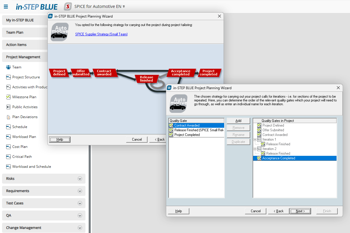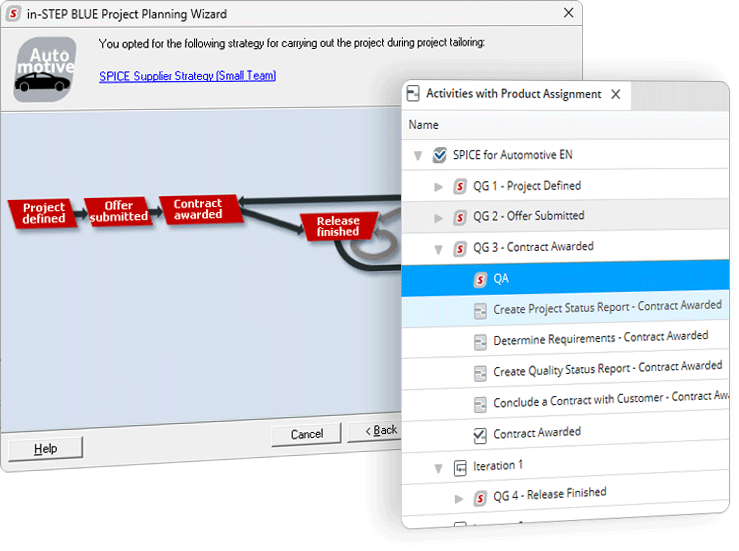 in-STEP BLUE SPICE Edition for Automotive features an extensive, customizable Automotive SPICE-compliant development process. The built-in tailoring wizard generates a SPICE-compliant process, tailored to the specific characteristics of your project and the built-in project planning assistant helps you structure your project based on project specific, Automotive SPICE-compliant processes. And you’re on your way to SPICE Level 3.