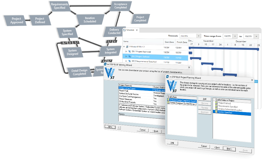 In many cases, contracting authorities and public authorities require the V-Modell XT. in-STEP BLUE provides efficient support for all V-Modell XT projects. in-STEP BLUE makes V-Modell-XT-compliant planning of your projects easy. It features activity and product templates and supports you in the planning and documentation of all required quality assurance measures. in-STEP BLUE V-Modell XT Edition comes with a number of integrated wizards: