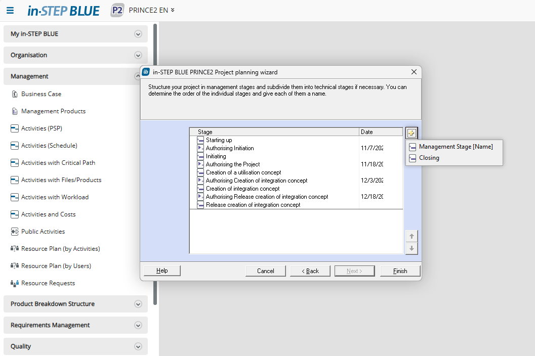 Planning in your projects depends on your processes. PRINCE2 offers a project planning assistant for this purpose. This assistant supports planning with just a few clicks.
