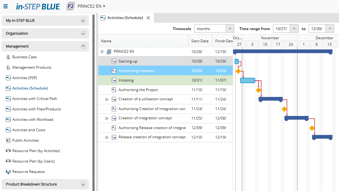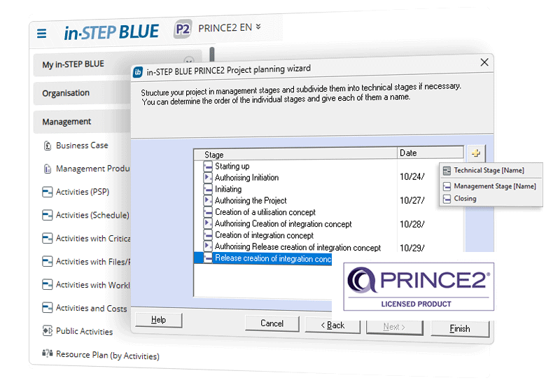 PRINCE2 takes a process oriented approach. It also offers project management features on the basis of defined processes. in-STEP BLUE helps you to stick to processes given that all project planning takes place on the basis of processes. Every project has its own process in the software. If you happen to learn something new during a project then you can use this knowledge in an adjusted process in a new project. Sounds simple right? Because it is.
