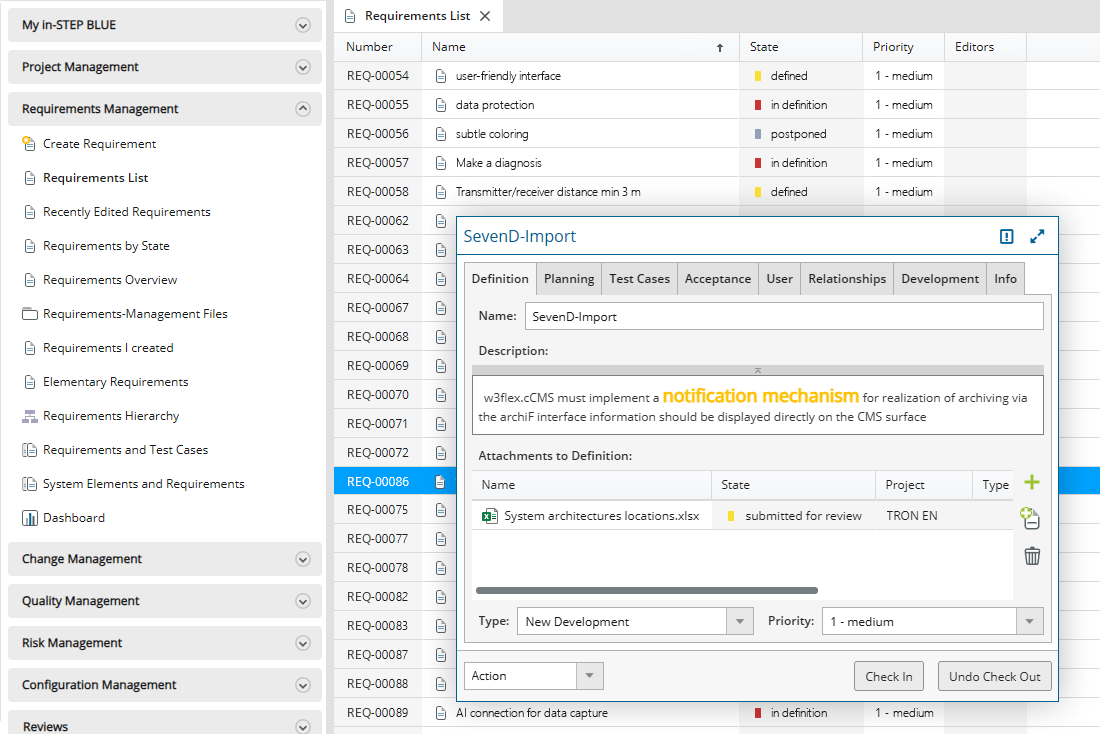 Click here for a list of functions of requirements management with in-STEP BLUE