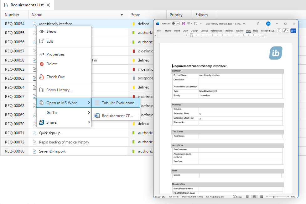 Of course, you can also process information from in-STEP BLUE in other tools. For example, requirements can be displayed in tabular form in Word with all the associated information.