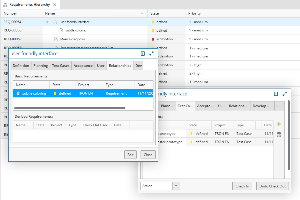 Requirements can be easily recorded using forms in in-STEP BLUE. You can customize the appearance of the form, the properties used, additional tabs, etc. according to your needs. Or you can simply use the standard form provided and thus have access to all information relating to a specific requirement at any time.