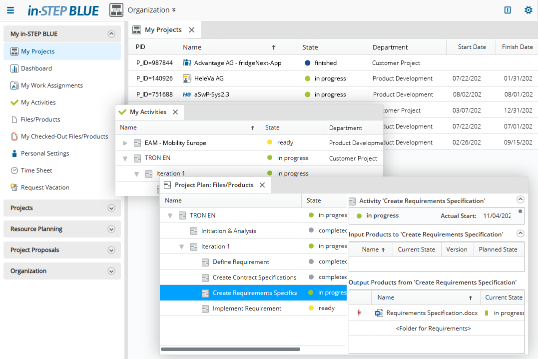 All relationships between requirements, all changes and change requests and all other relevant project information are accessible with in-STEP BLUE.