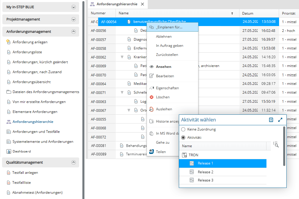 Hier finden Sie eine Liste mit Funktionen beim Anforderungsmanagement mit in-STEP BLUE