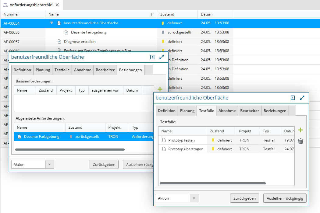Anforderungsmanagement und Projektmanagement in einer Software.