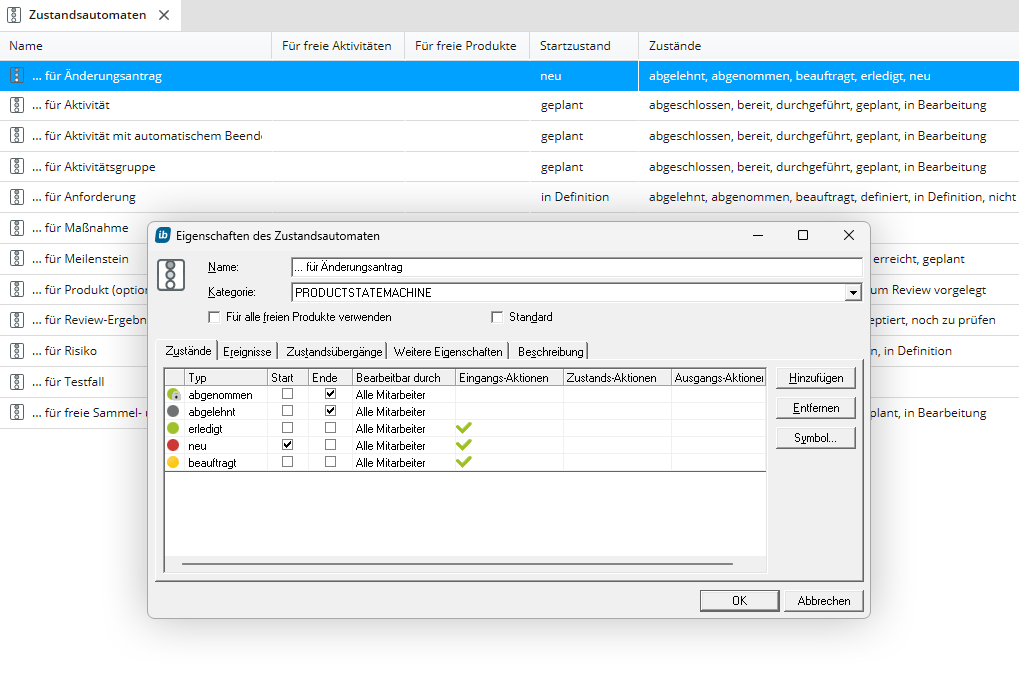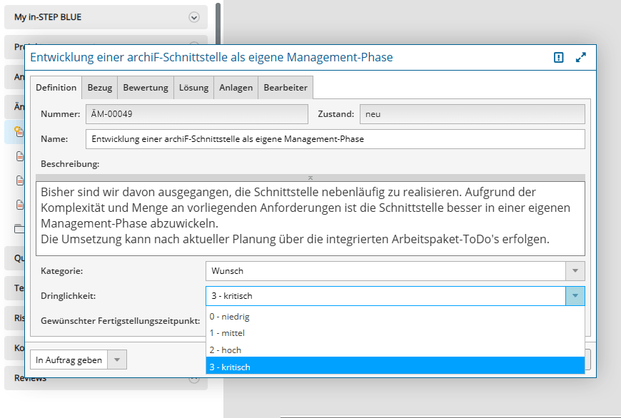 Apropos Zustände: Leicht definieren Sie in in-STEP BLUE die Zustände, die ein Änderungsantrag durchlaufen kann, sowie die entsprechenden Zustandsübergänge. Mittels der Zustände können Sie auch automatische Benachrichtigungen verschicken, bspw. wenn ein ‘beantragter Änderungsantrag’ ‘genehmigt” wurde.