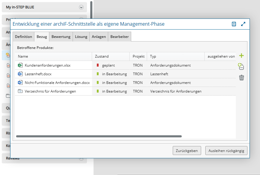 Hier finden Sie eine Liste mit Funktionen beim Change Management mit in-STEP BLUE