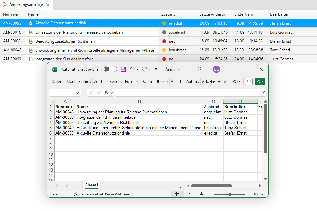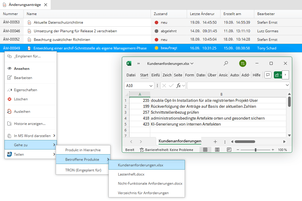Natürlich stehen Ihnen auch beim Umgang mit Change Requests viele Optionen zur Verfügung. So können Sie sich Unterschiede zwischen verschiedenen Versionen eines Change Requests anschauen, Zustände verändern oder auch direkt zu betroffenen Elementen – hier bspw. das Exceldokument ‚Kundenanforderungen‘ – navigieren.