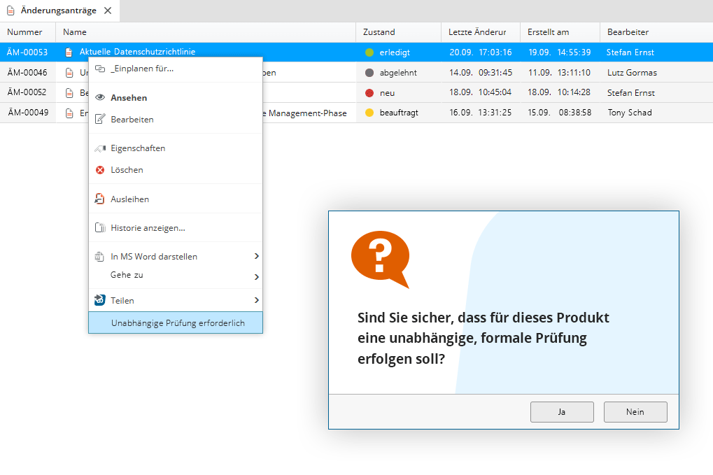 Wollen Sie separate, formale Prüfungen im Rahmen eines definierten Prozesses durchführen? Kein Problem, denn Sie definieren nicht nur Zustände, sondern können das gesamte Handling von Änderungen nach Ihren Vorstellungen festlegen. So erhalten Sie die optimale Unterstützung für den Umgang mit allen anfallenden Änderungen.