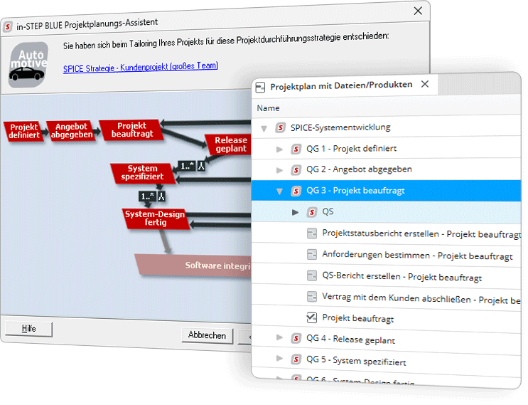 Für die Software- und Systemerstellung legt das SPICE for Automotive einen großen Schwerpunkt auf die zu erstellenden Produkte und die Qualität dieser Produkte. Und in-STEP BLUE bietet als Software genau dafür einen Produktplanungsassistenten und einen QS-Planungsassistenten an. So können Sie die Entwicklung oder den Betrieb eines Systems besser kalkulieren und steuern. Und die einheitliche Beschreibung und Definition der Begrifflichkeiten erhöht das Verständnis der Projektbeteiligten. Mehr Transparenz, weniger Reibungsverluste im Projektmanagement, eine integrierte, automatische Versionierung der Produkte und Dateien, und eine bessere Kommunikation mit dem Auftraggeber oder den Auftragnehmern und innerhalb des Projektteams ist das Ergebnis – das sind die Vorteile der in-STEP BLUE SPICE for Automotive Edition.
