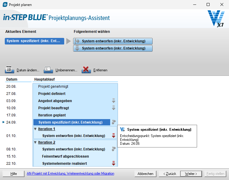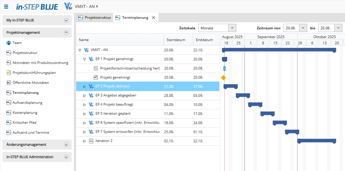 Mit dem in-STEP BLUE Projektplanungsassistenten für das V-Modell XT definieren Sie Ihren Terminplan. Und diesen Terminplan schreiben Sie im Laufe des Projekts automatisch fort, denn auch Ihre Mitarbeiter arbeiten mit derselben Software. So arbeiten alle Beteiligten stets mit aktuellen Informationen.