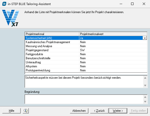 Mit in-STEP BLUE und dem V-Modell XT verbessern Sie die Qualität Ihrer Entwicklungsergebnisse nachhaltig. Zu Beginn des Projektes nutzen Sie für das Tailoring einfach den in-STEP BLUE Tailoring-Assistenten. In wenigen Minuten bestimmen Sie Ihre Projektmerkmale in der Software und schaffen damit die Grundlage für die Ausschreibung Ihres Projekts als Auftraggeber oder die Durchführung Ihres Projekts als Auftragnehmer. Ergeben sich im Laufe der Zeit neue grundsätzliche Aspekte, können Sie natürlich auch wieder dynamisch tailoren. So haben Sie jederzeit einen Prozess zur Verfügung, der eine ideale Basis für Ihr V-Modell XT Projektmanagement und Ihre Systementwicklung bietet.