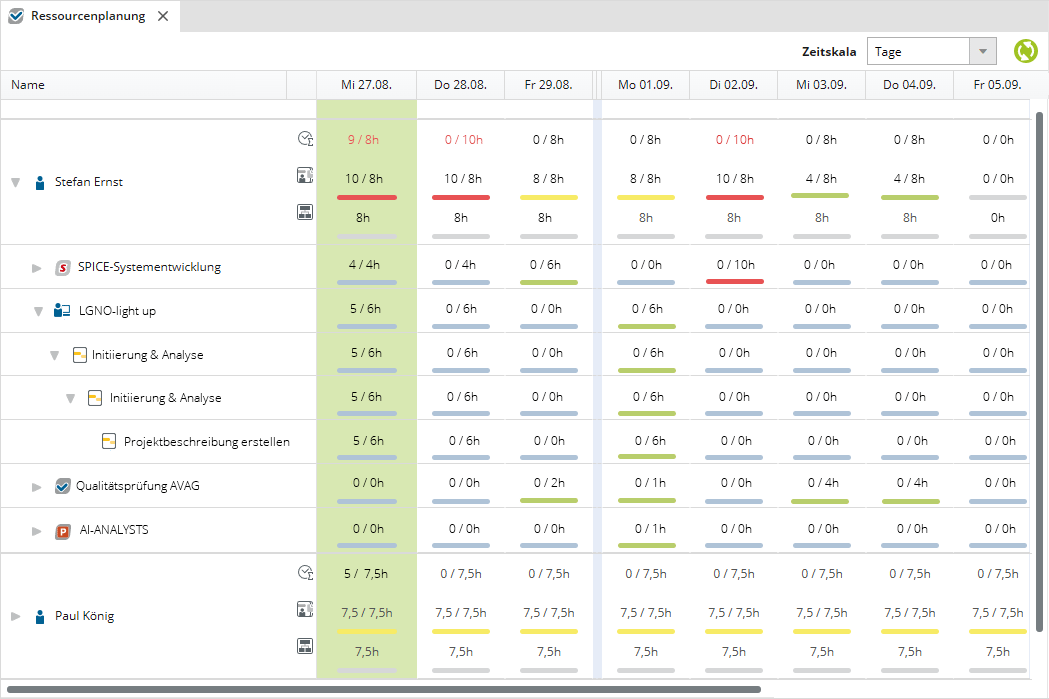 Mitarbeiter haben Fähigkeiten und Kapazitäten. Wie sieht denn die Auslastung von “Bärbel Krauss” aus? In welchen Projekten arbeitet sie gerade und an welchen Aufgaben?