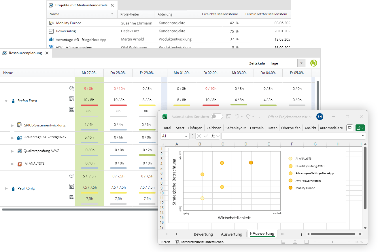 Wie geht es Ihren Projekten? Wie ist die Auslastung der Mitarbeiter? Fertigstellungsindikatoren, Statusmeldungen und grafische Informationen lassen sich leicht darstellen und nutzen.