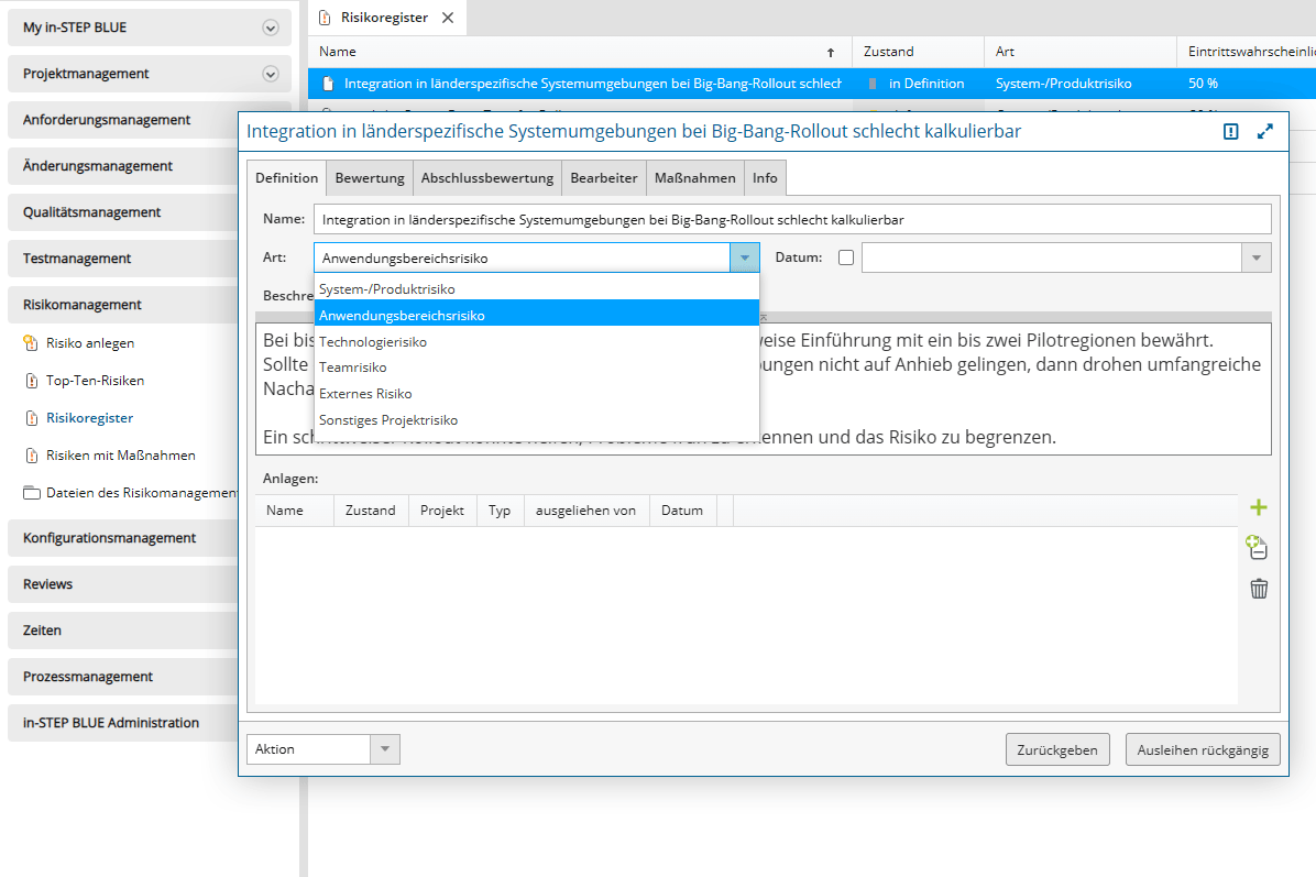 Wie Sie Ihr Risikomanagement strukturieren und welche Informationen Sie wie erfassen wollen, können Sie natürlich frei definieren. Oder Sie nutzen einfach das im Standardlieferumfang von in-STEP BLUE integrierte Formular zum Umgang mit Ihren Risiken. So können Sie schnell und sicher starten.