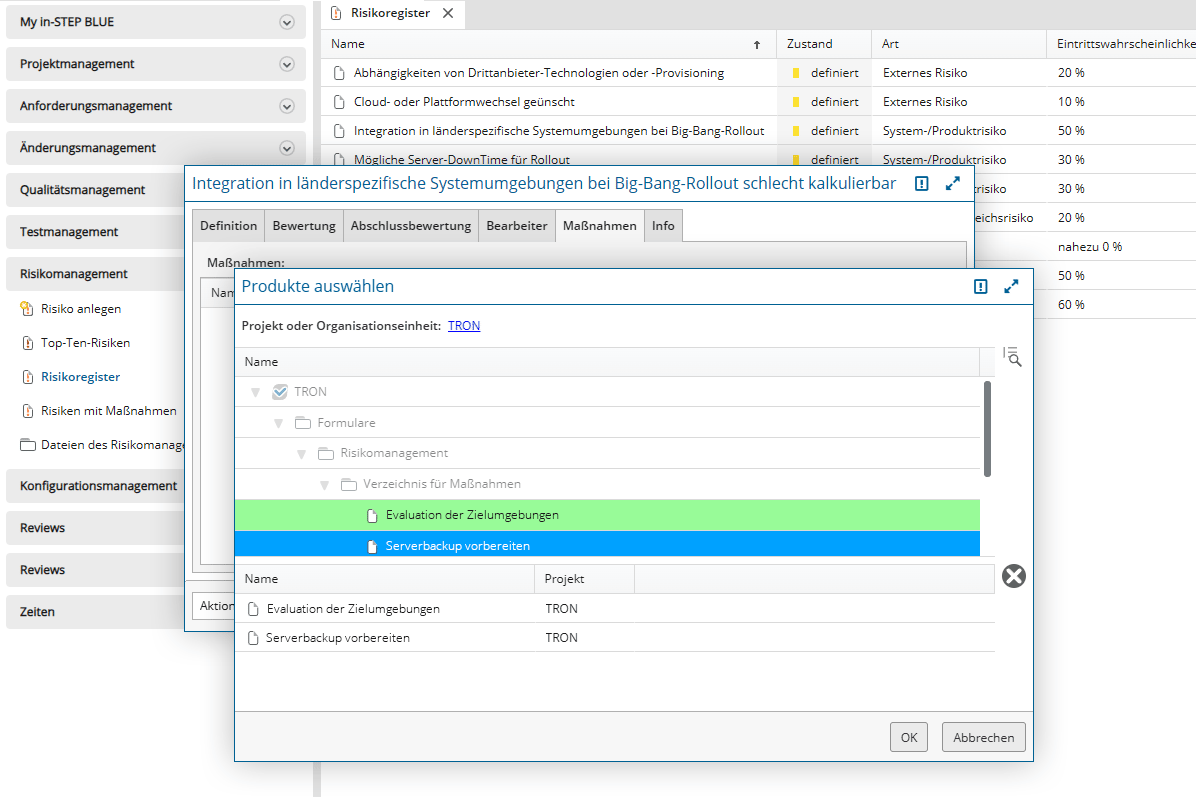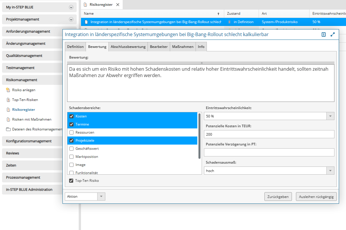 Hier finden Sie eine Liste mit Funktionen beim Risikomanagement mit in-STEP BLUE