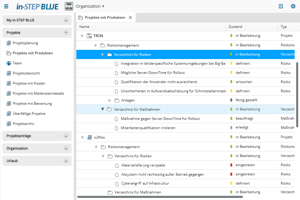 Und auch auf Organisationsniveau lassen sich Risiken anzeigen. Sie können auch ein zentrales Risikomanagement in in-STEP BLUE definieren und dann Maßnahmen für einzelne Projekte ableiten. in-STEP BLUE ist Ihre Software und es ist Ihr Prozess zum Umgang mit Risiken.