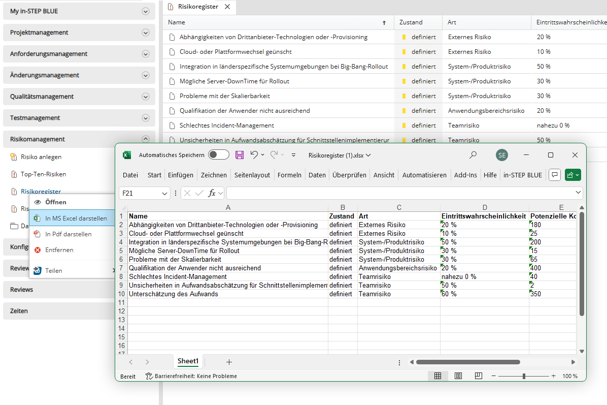Mit in-STEP BLUE verwalten Sie Ihre Risiken in derselben Software, mit der Sie auch Ihre Projekte durchführen und sich um Anforderungen und Änderungen kümmern. In Echtzeit. Ohne unnötige Schnittstellen. So wird Risikomanagement transparent.
