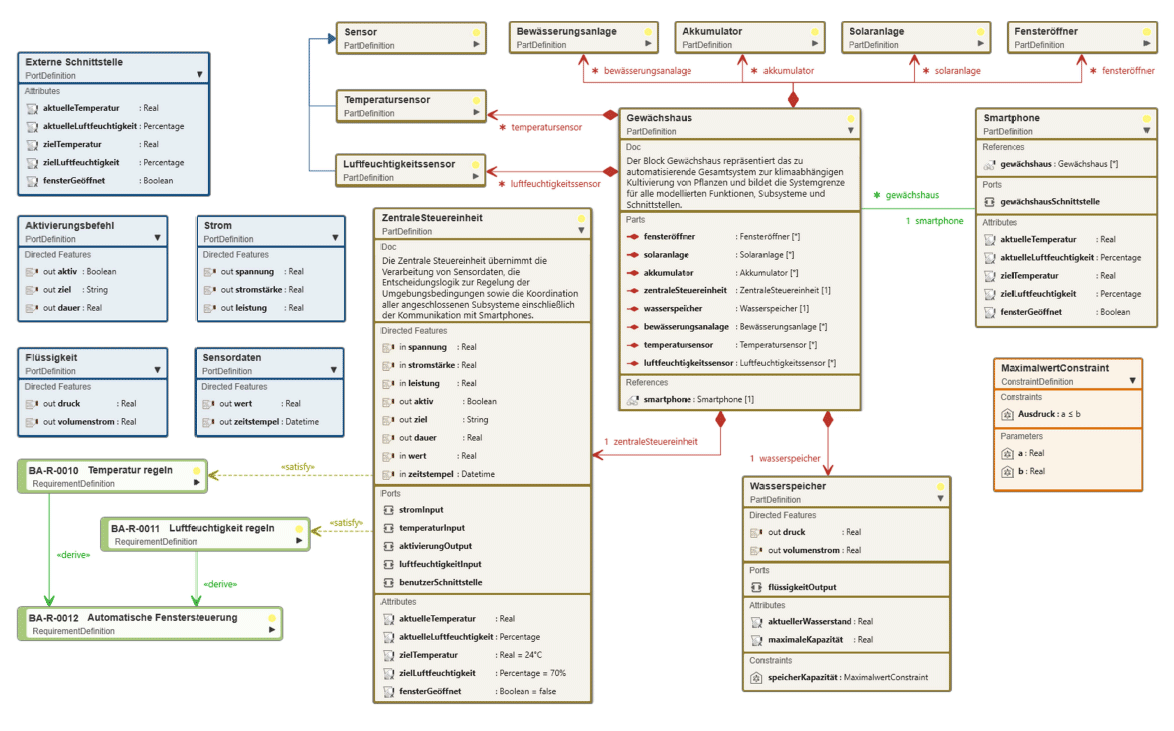 Die Interconnection View entspricht dem Internal Block Diagram (IBD) aus der SysML 1.x. Sie zeigt die interne Struktur eines Systems einschließlich der Teilsysteme (Parts) und deren Beziehungen (Connectors).